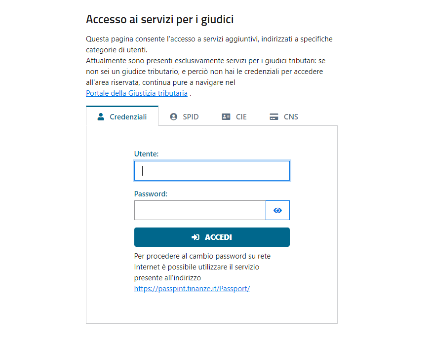 Le credenziali da utilizzare consistono di un nome utente, corrispondente al proprio Codice Fiscale, e una password provvisoria che viene comunicata dalla Corte di Giustizia Tributaria.