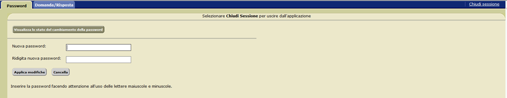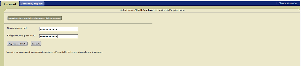 La nuova password è stata, così, memorizzata e si può procedere alla chiusura dell’applicazione di cambio password selezionando il link "Chiudi sessione" posto in alto a destra della schermata.