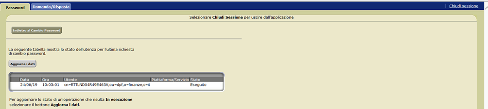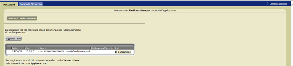 L’utente deve selezionare il pulsante Aggiorna dati fin quando lo "Stato" del cambio password, da "In esecuzione", diviene “"Eseguito".
